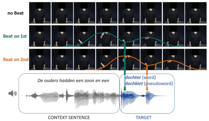 Participants watched a talker saying sentences where the final word was a very predictable bisyllabic word, given the sentence context (e.g., De ouders hadden een zoon en een dochter; “The parents had a son and a daughter”). However, sometimes instead of the predictable word the sentence ended in a pseudoword (e.g., dochkiet). In a lexical decision task, participants had to decide as fast as possible whether the final word was an actual Dutch word or a pseudoword. Moreover, sometimes the talker would say the final word without any gesture (above: “No Beat”), sometimes with a beat gesture on the syllable with lexical stress (Beat on 1st) and sometimes (incongruently) on the syllable without lexical stress (Beat on 2nd). Critically, people’s reaction times showed that participants generally reacted faster to words when they saw a beat gesture. Also, the fastest reaction times were found when the beat gesture was correctly aligned to words with word-initial stress.